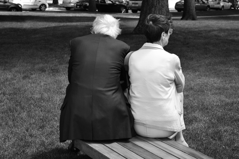 1. They do not need to watch each other they feel what they think with just a little touch. There is the long life behind them. Separated people do not seat like them. Nice shot.